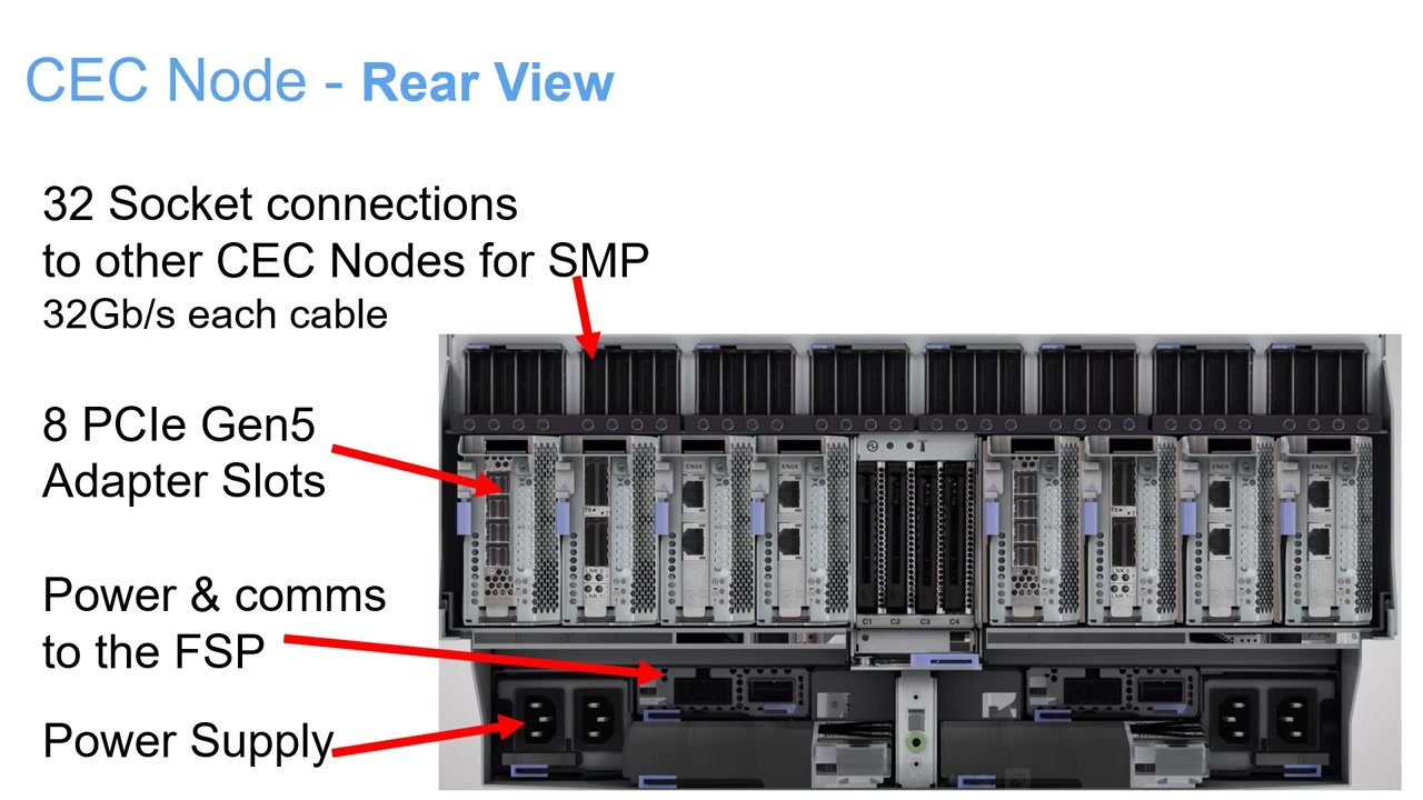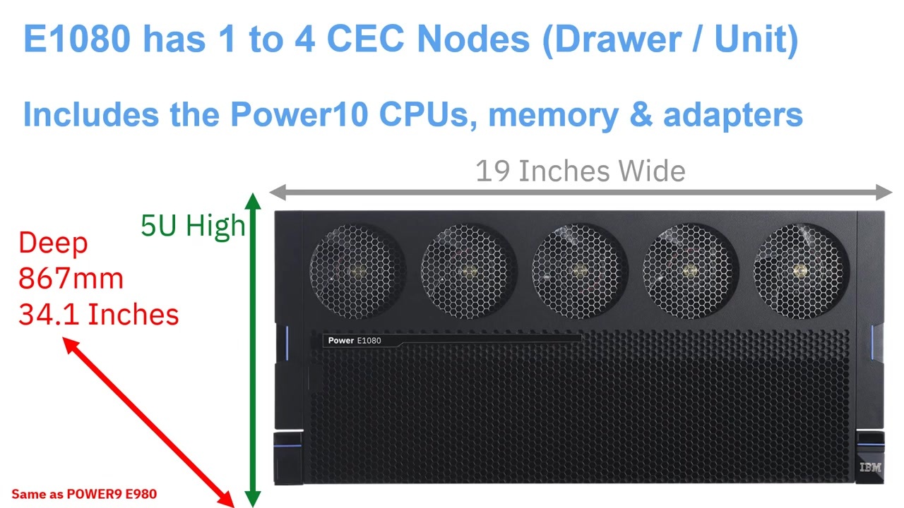 이전 버전인 Power9 E980과 같은 사이즈이며, CPU, Memory, Adapter 등이 포함된 Kek node를 최대 4개까지 단일 머신(또는 Drawer)에 사용할 수 있어요.