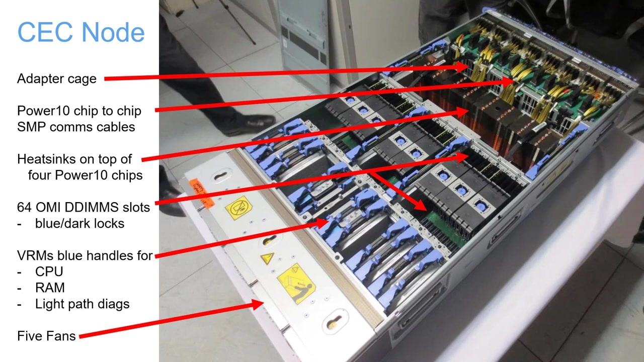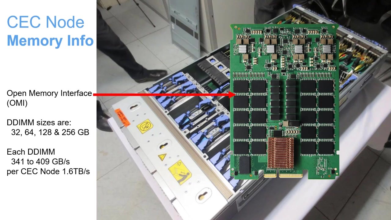 노드 내부에는 OMI(Open Memory Interface)를 포함한 64개의 메모리 카드 슬롯과 프로세서 간 미러링을 공유하는 인터 노드 케이블, 프로세서 상단의 히트 싱크 등이 있어요.